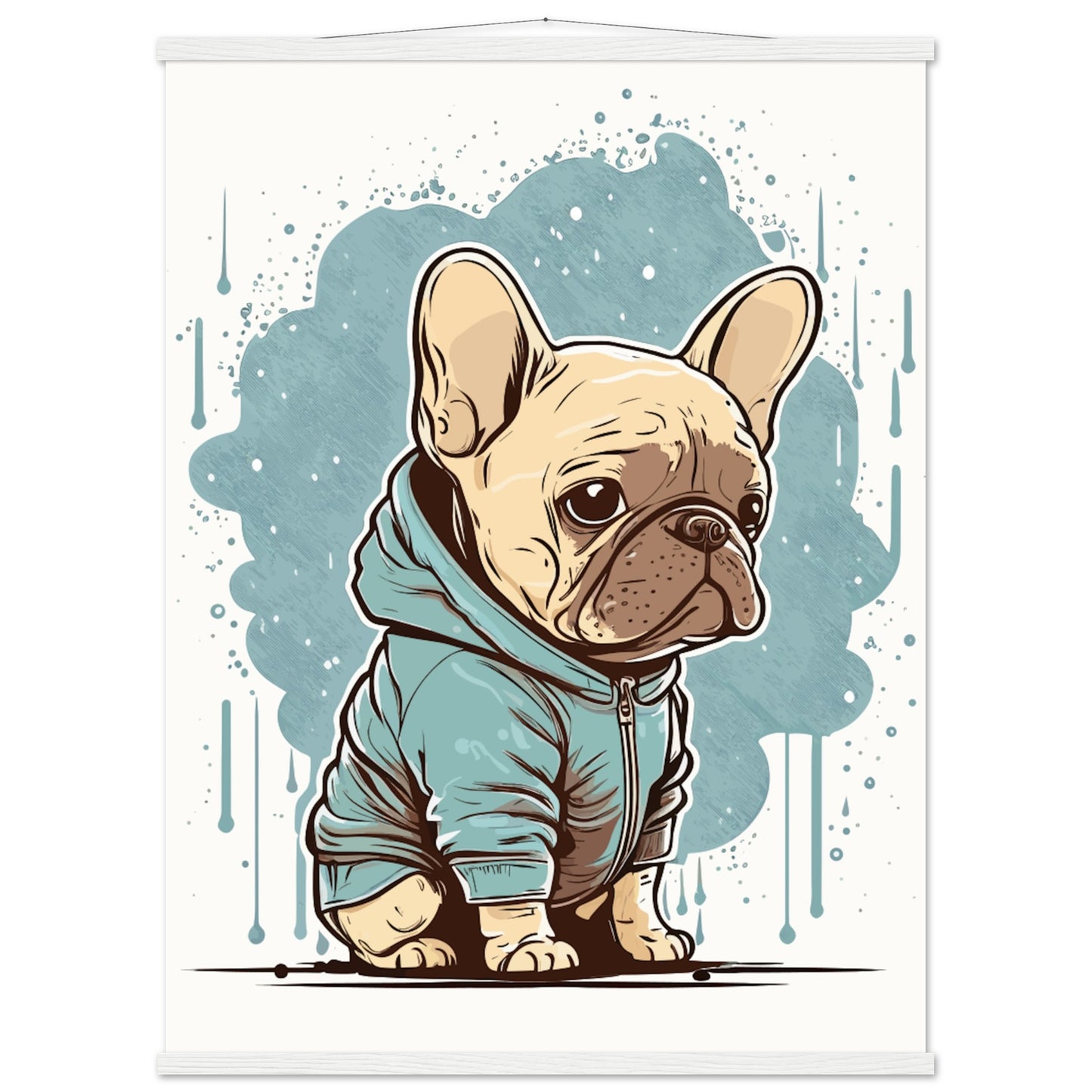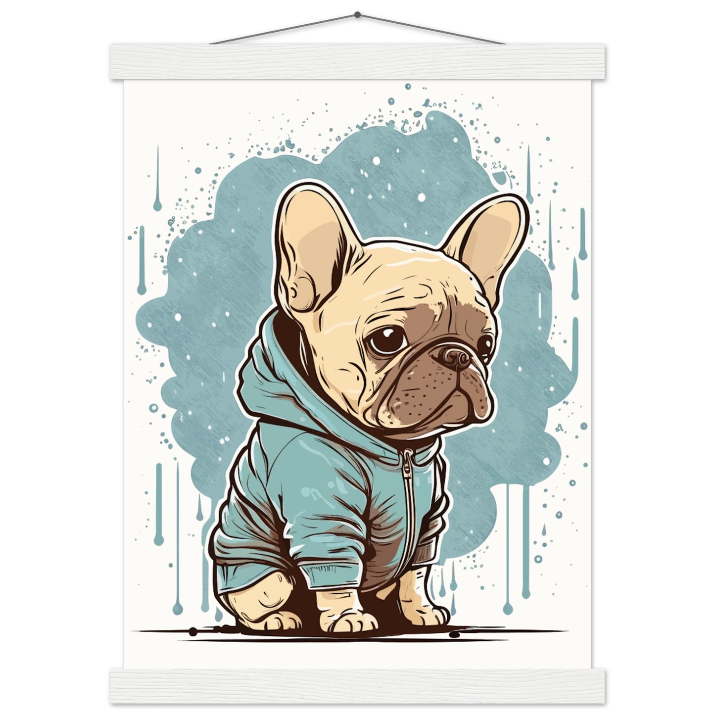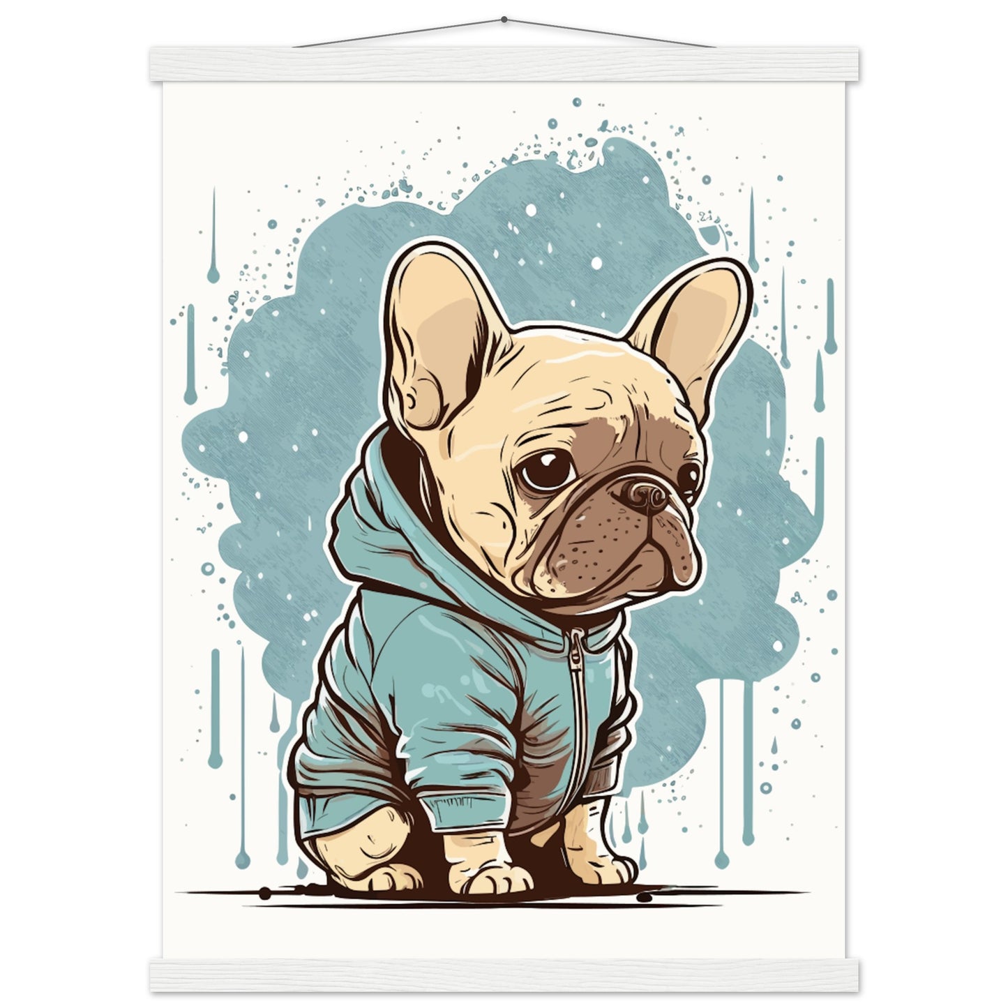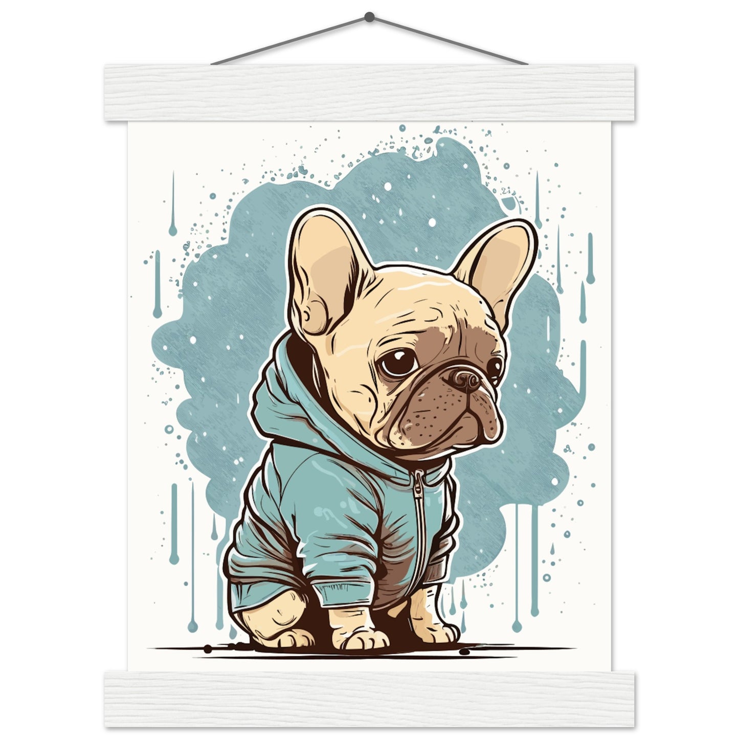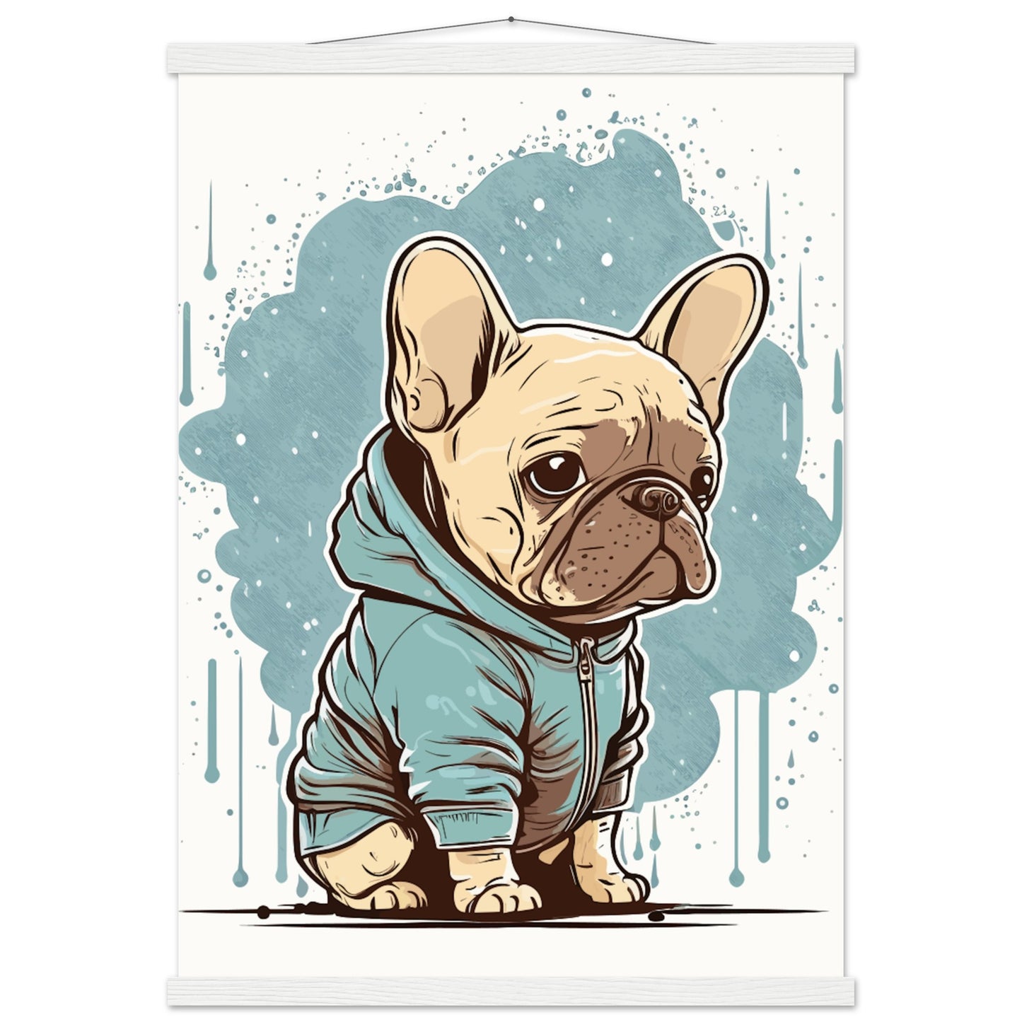 Hundeposter – Süße französische Bulldogge mit hellem Kapuzenpullover – Premium-Matt-Poster mit Aufhänger