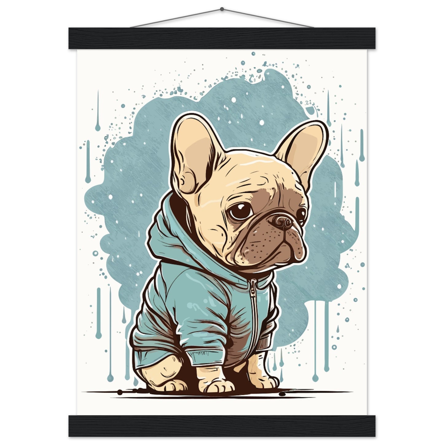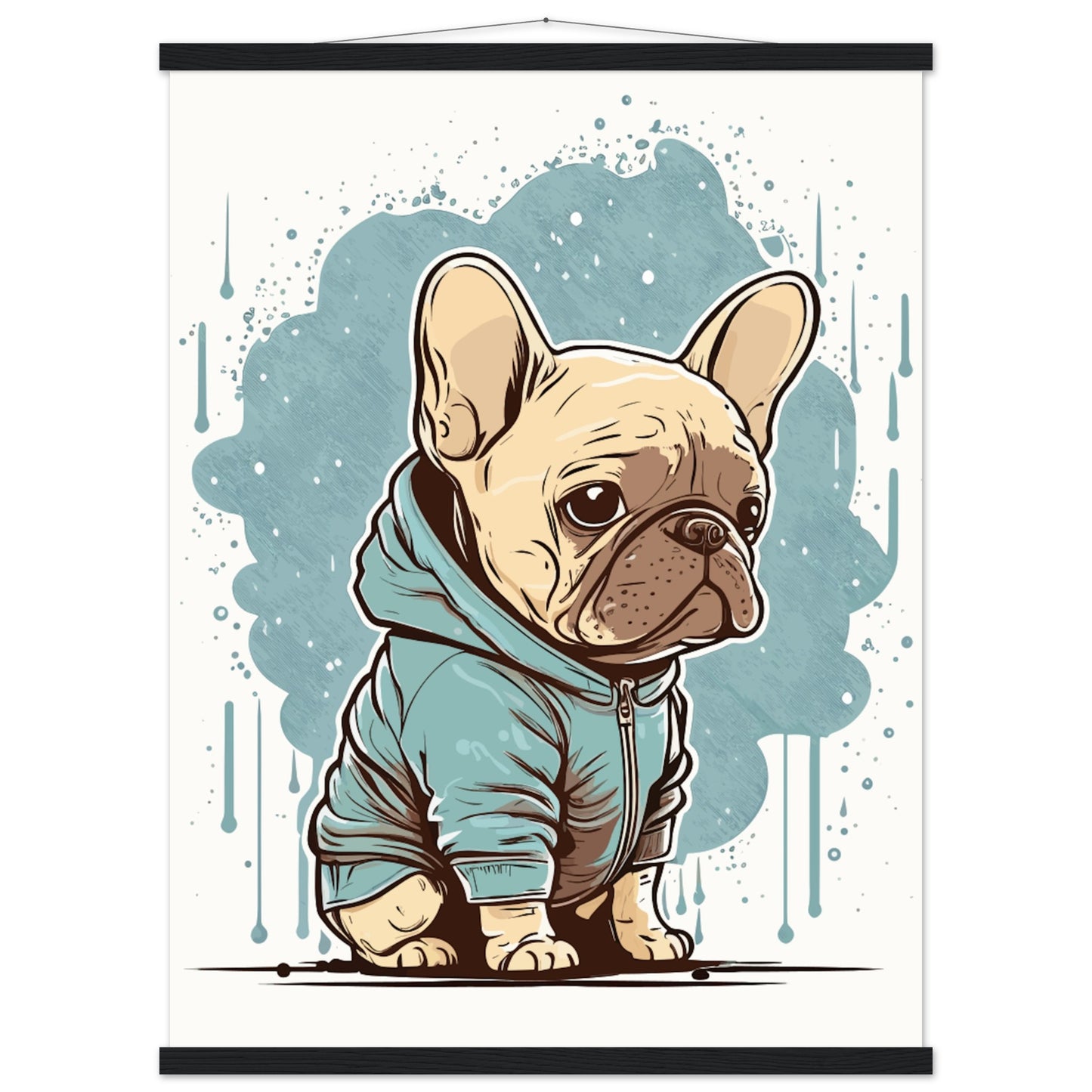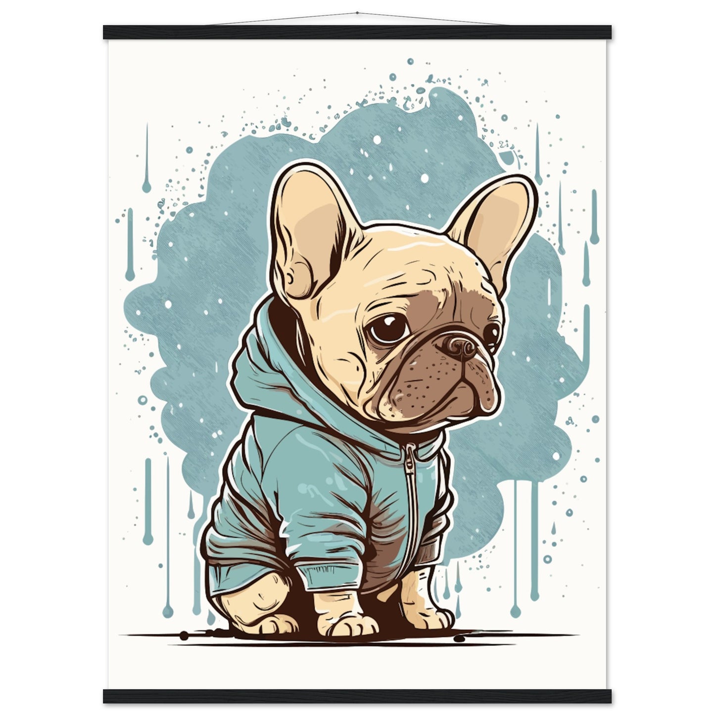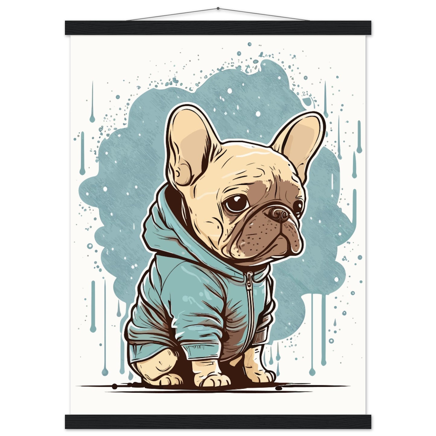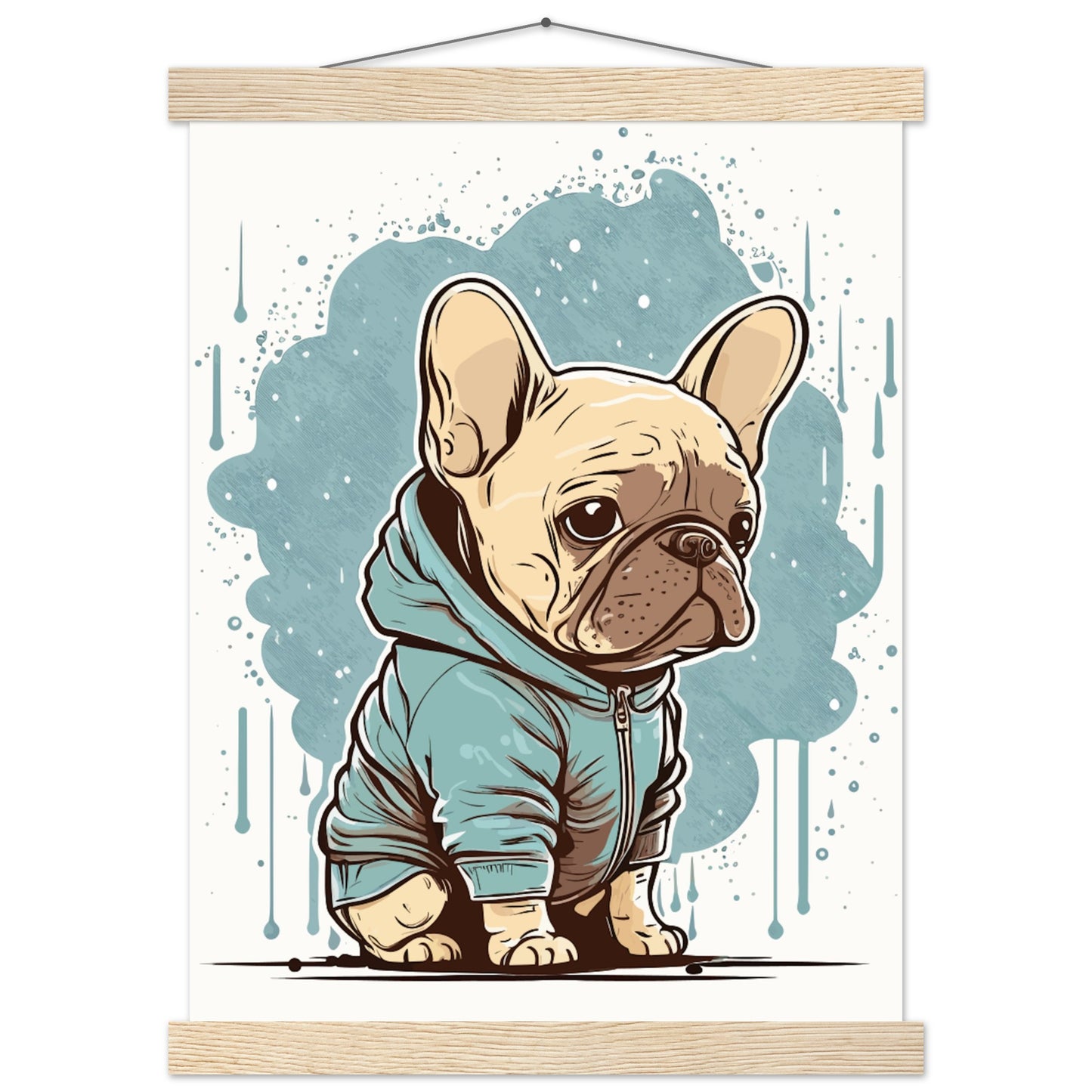 Hundeposter – Süße französische Bulldogge mit hellem Kapuzenpullover – Premium-Matt-Poster mit Aufhänger