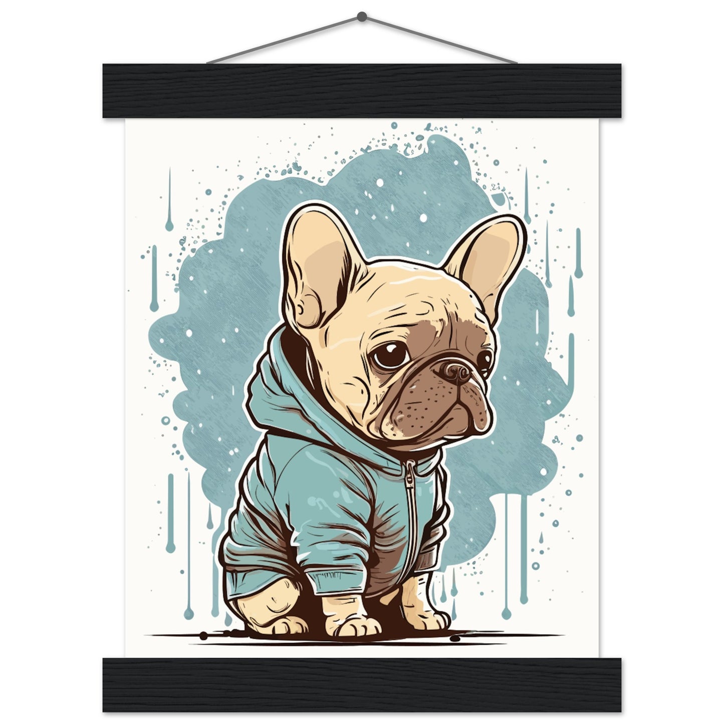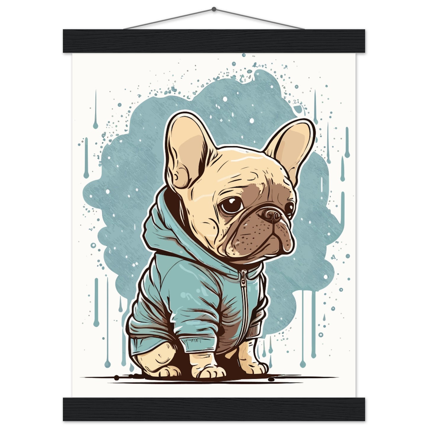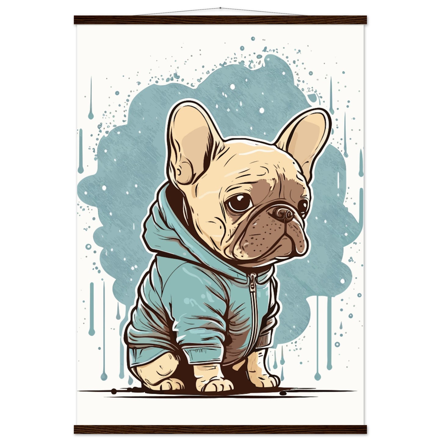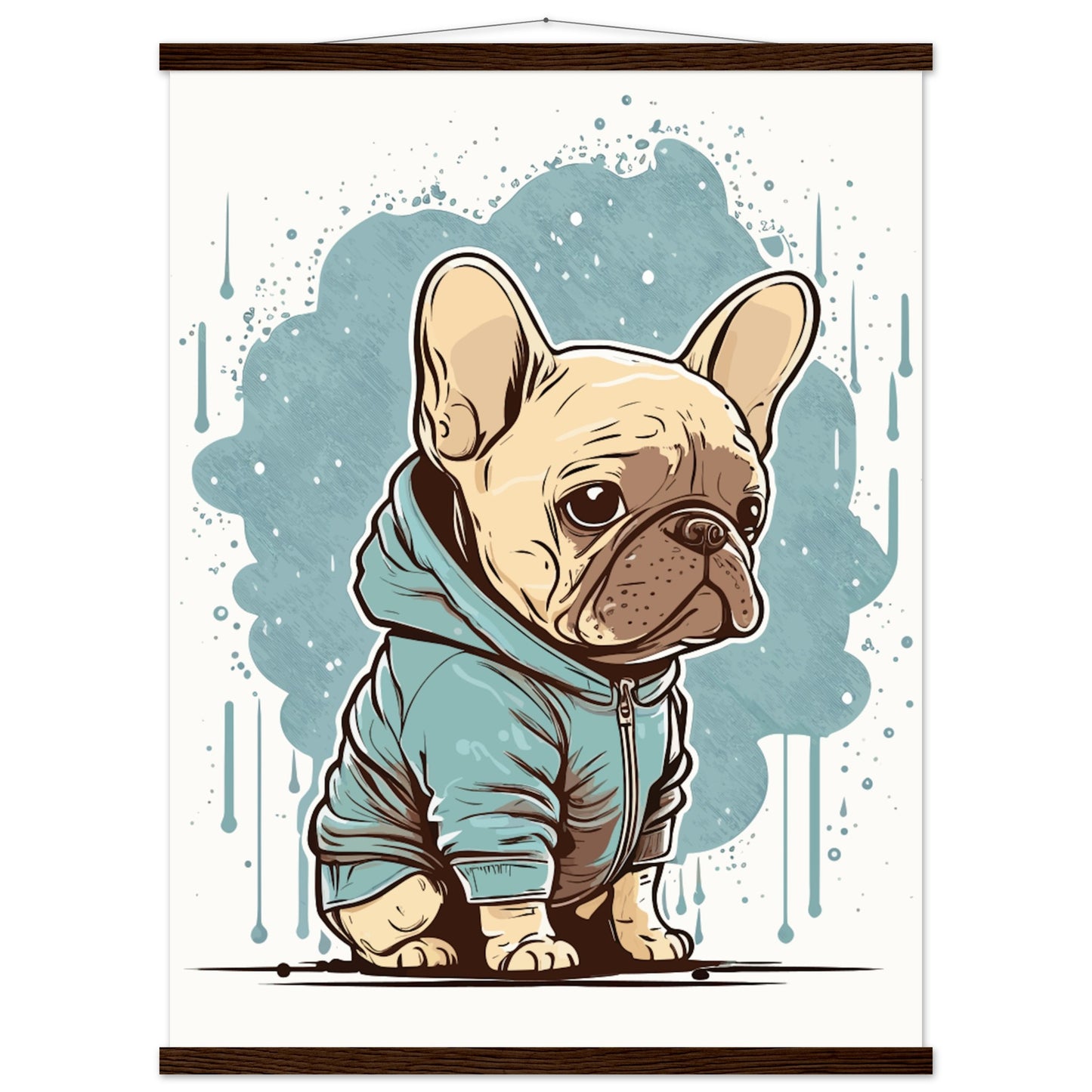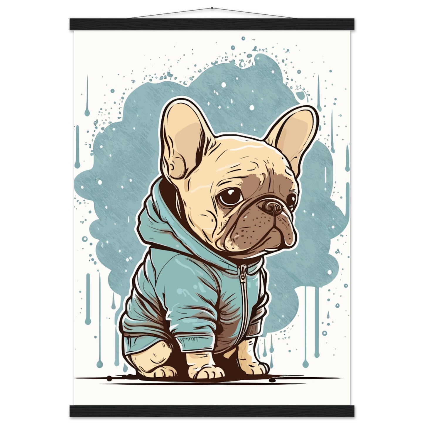 Hundeposter – Süße französische Bulldogge mit hellem Kapuzenpullover – Premium-Matt-Poster mit Aufhänger