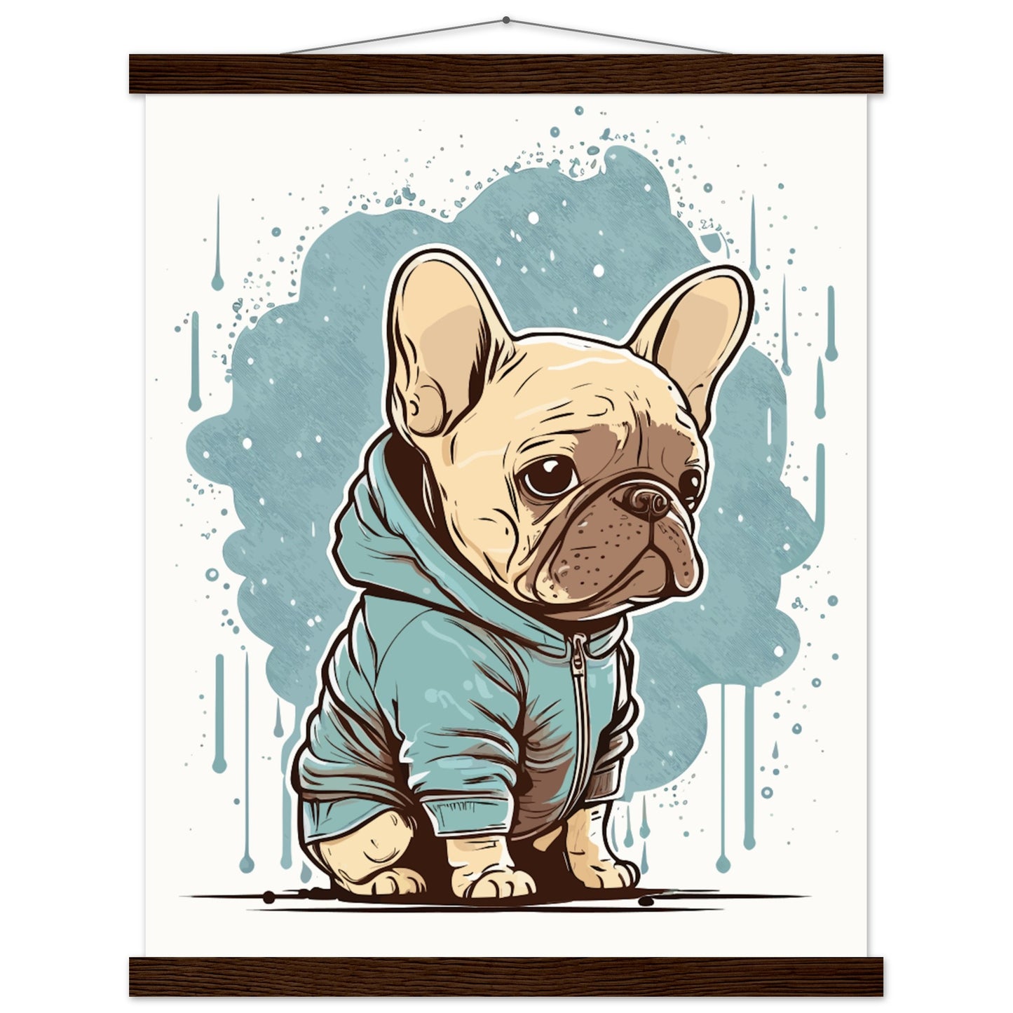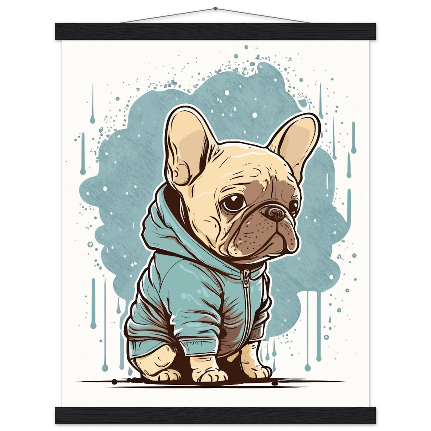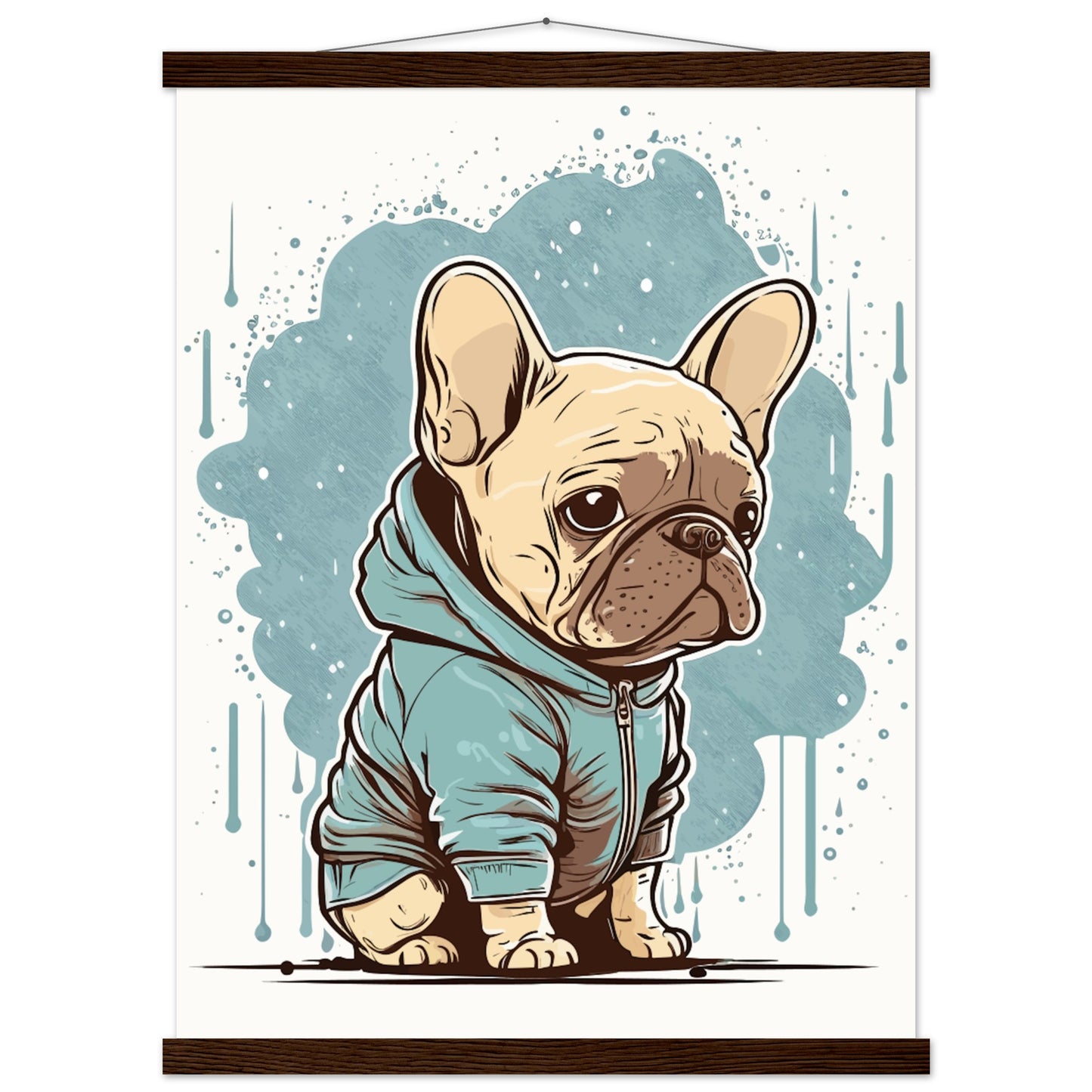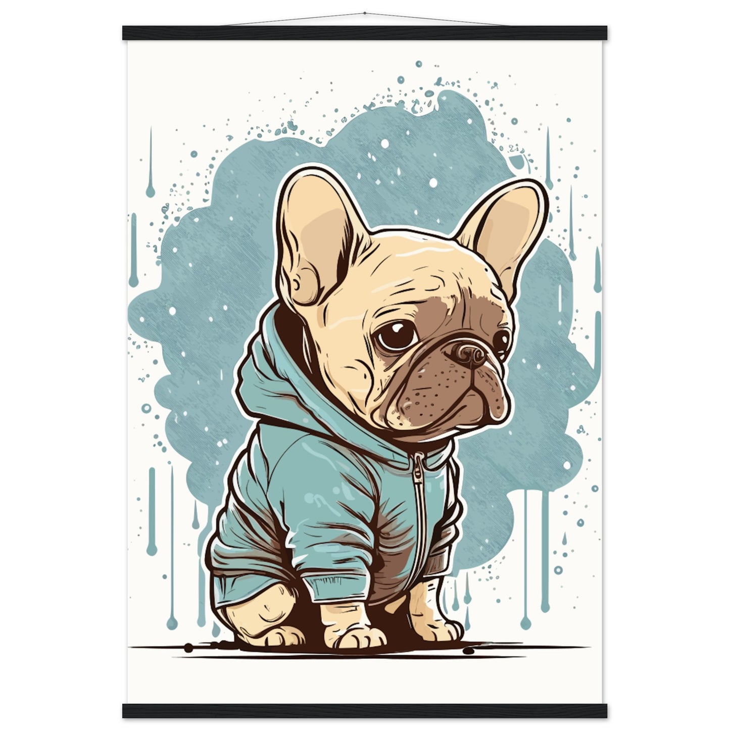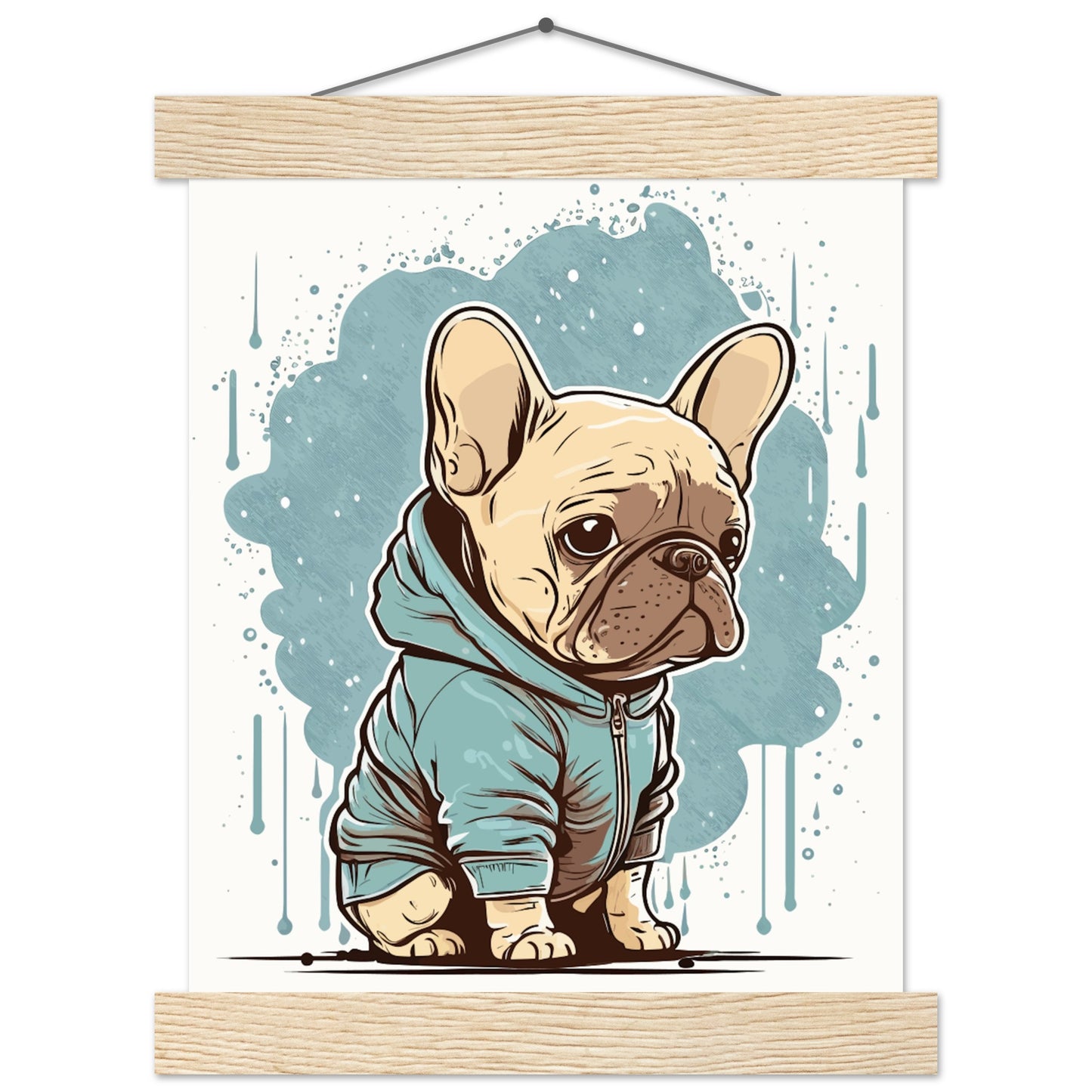 Hundeposter – Süße französische Bulldogge mit hellem Kapuzenpullover – Premium-Matt-Poster mit Aufhänger